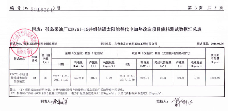 2017年11月20日,對勝利油田孤島采油廠采油管理十區(qū)的KXK761-15井組原油儲(chǔ)罐進(jìn)行光熱自控加熱裝置技術(shù)改造,改造前噸液加熱單耗4.38kgce/t,改造后噸液加熱單耗2.19kgce/t ,節(jié)能率49.9%。
